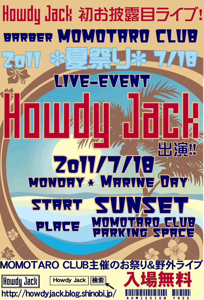 “Barber MOMOTARO CLUB”という散髪屋さんがあります ![]() そこで毎年、海の日(今年は7月18日)に夏祭りが催しされます。 MOMOTARO CLUBが主催され、 お客様や、オーナー&スタッフに縁のある方々が集まって、 (屋台などの出店あり)食べたり、飲んだり、 賞品が当たる抽選会などで、楽しく過ごすというイベントがあります。 “島ぞうり”という今年ブレイクしそうなアイテムも展示即売会もありますよぉ~ ![]() (これは、かなり必見 ) ★島ぞうりアート工房彫人★そこでちょっとしたステージを作ってライブも開催されます ![]() 『Howdy Jack』が出演させていただく事になりました ![]() 実は、人前で演奏するのは今回が初めてとなります ![]() “初御披露目ライブ”と称しまして、頑張ります ![]() ☆是非、是非、観に来て下さいネ~ ![]() さて、開催場所の“MOMOTARO CLUB”の地図は、こちら 当日、店舗&駐車場スペースは開放されてて、入場料などは、フリーでございます ※夏祭りにお越しの方の駐車場は、ございません。 |